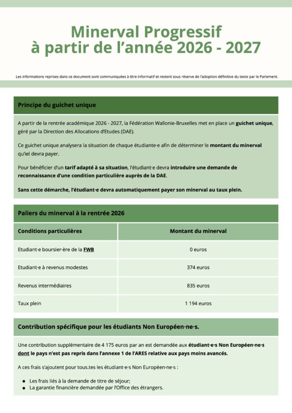 Pour des informations plus détaillées, veuillez vous référer à la Circulaire 9685 – Minerval applicable à partir de l’année académique 2026-2027 : conditions et modalités d’application.